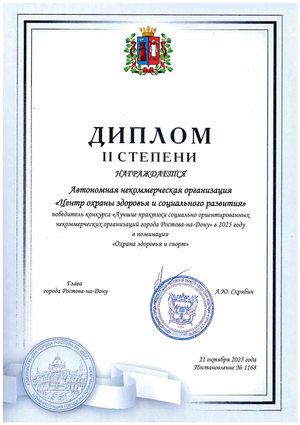 Победа в конкурсе - это значимая для нас оценка вклада в сохранение здоровья ростовчан. Это уже третья победа в ежегодном конкурсе "Лучшие практики социально ориентированных некоммерческих организации города Ростова-на-Дону". Дипломы III степени мы получили в 2024 и 2022 годах.
